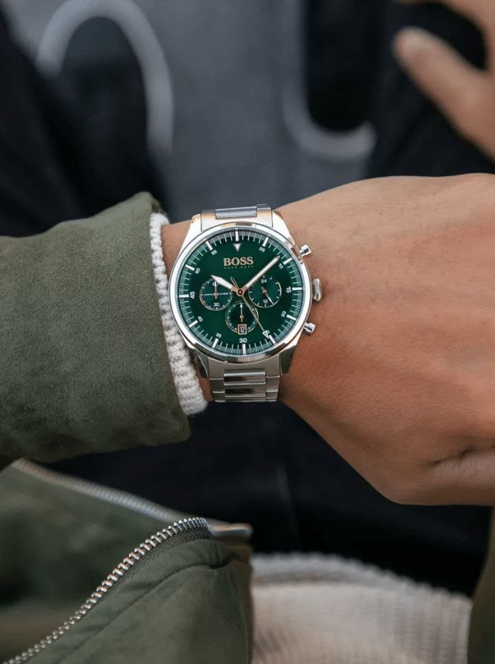 Cadran vert foncé avec trois sous-cadrans fonctionnels (chronographe 24h, minuteur, secondes)