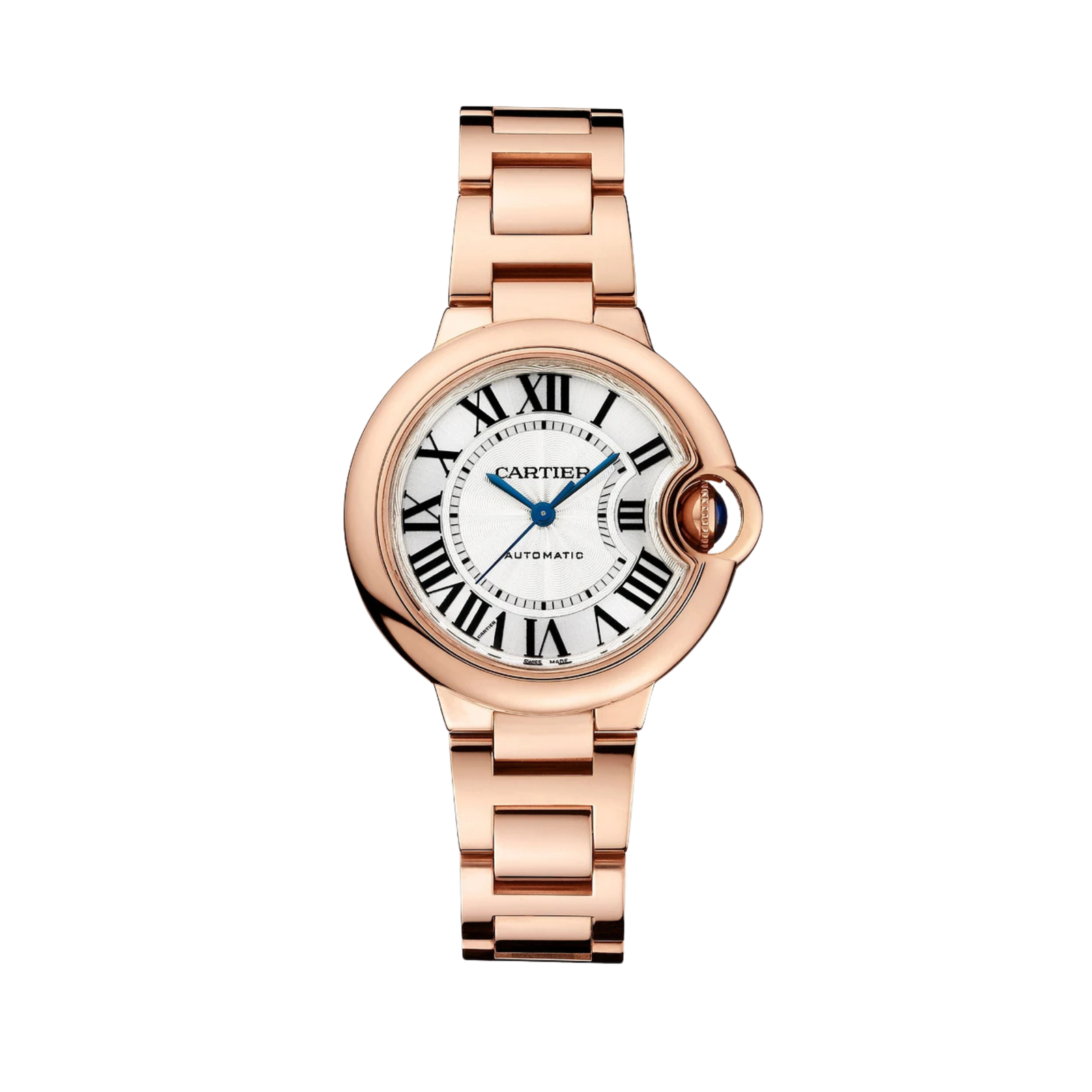 Cadran blanc avec chiffres romains noirs et aiguilles glaives bleuies, pour une lecture claire et sophistiquée.