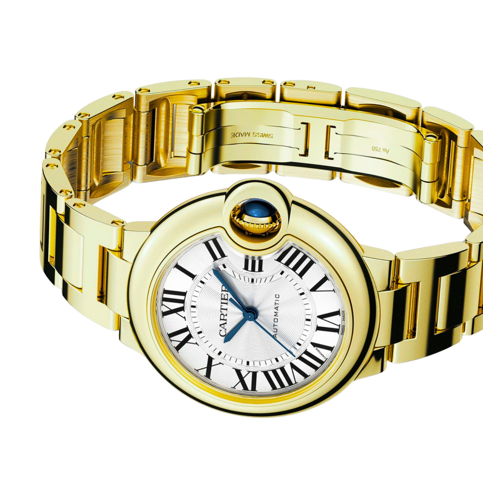 Couronne cannelée ornée d’un cabochon décoratif, signature d’inspiration horlogère.