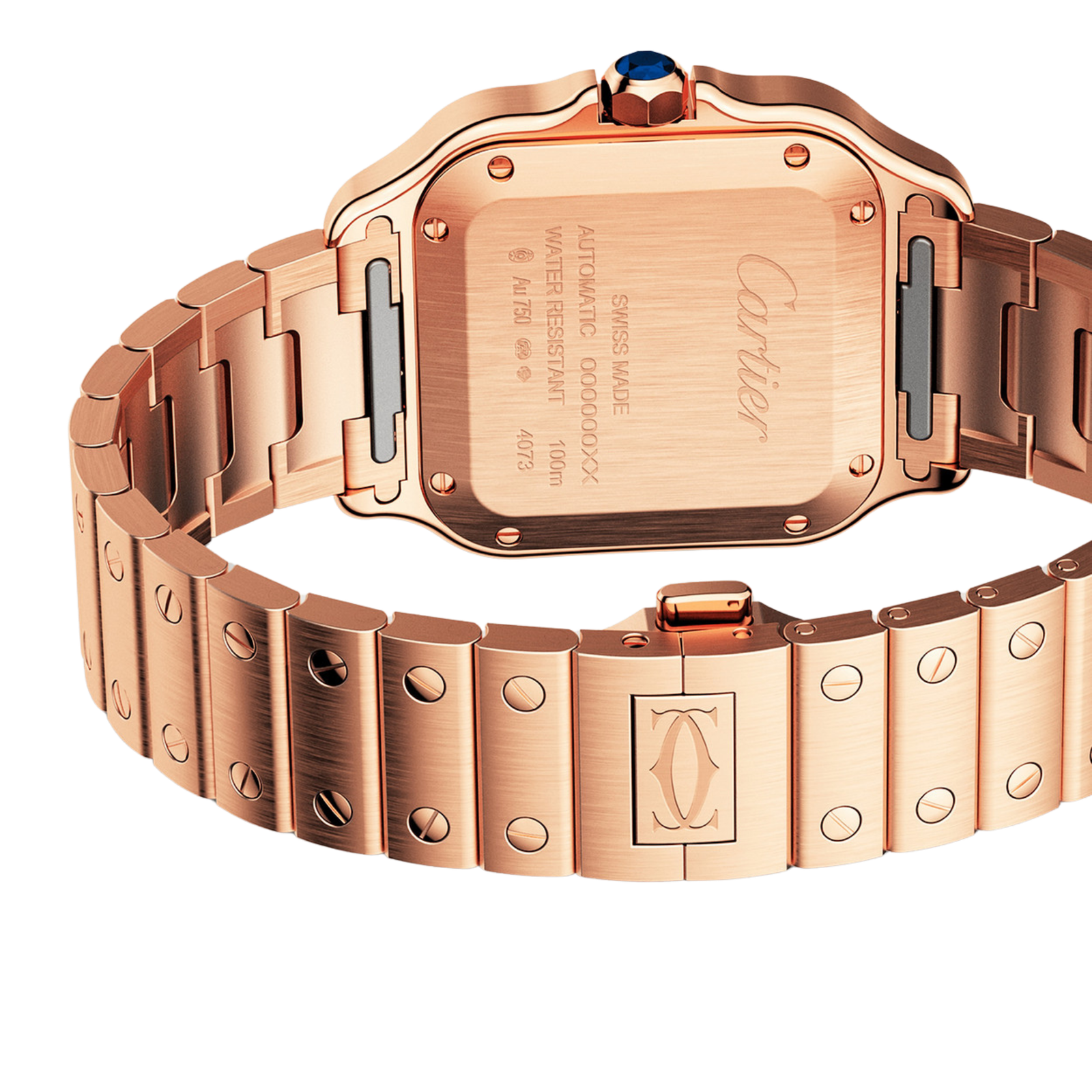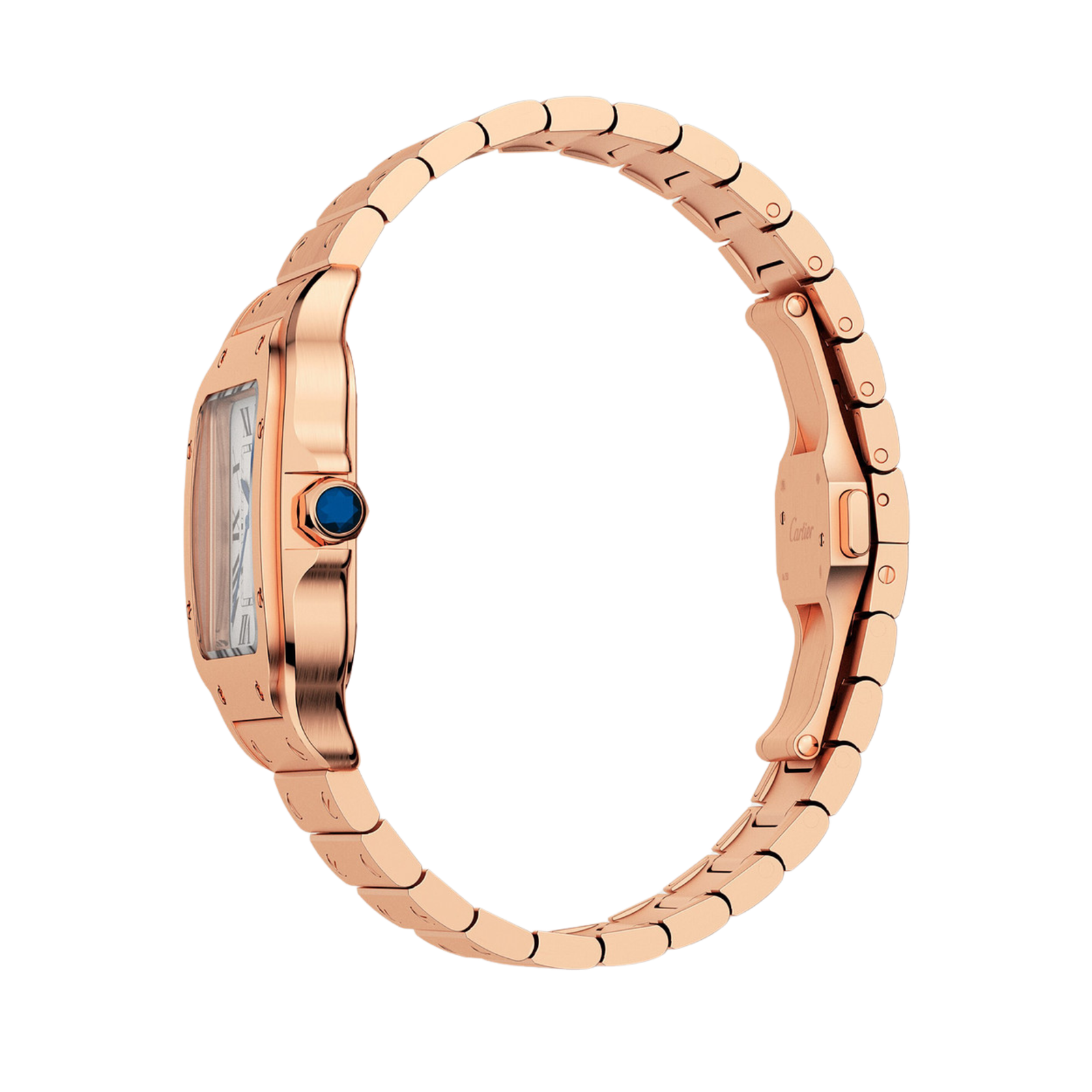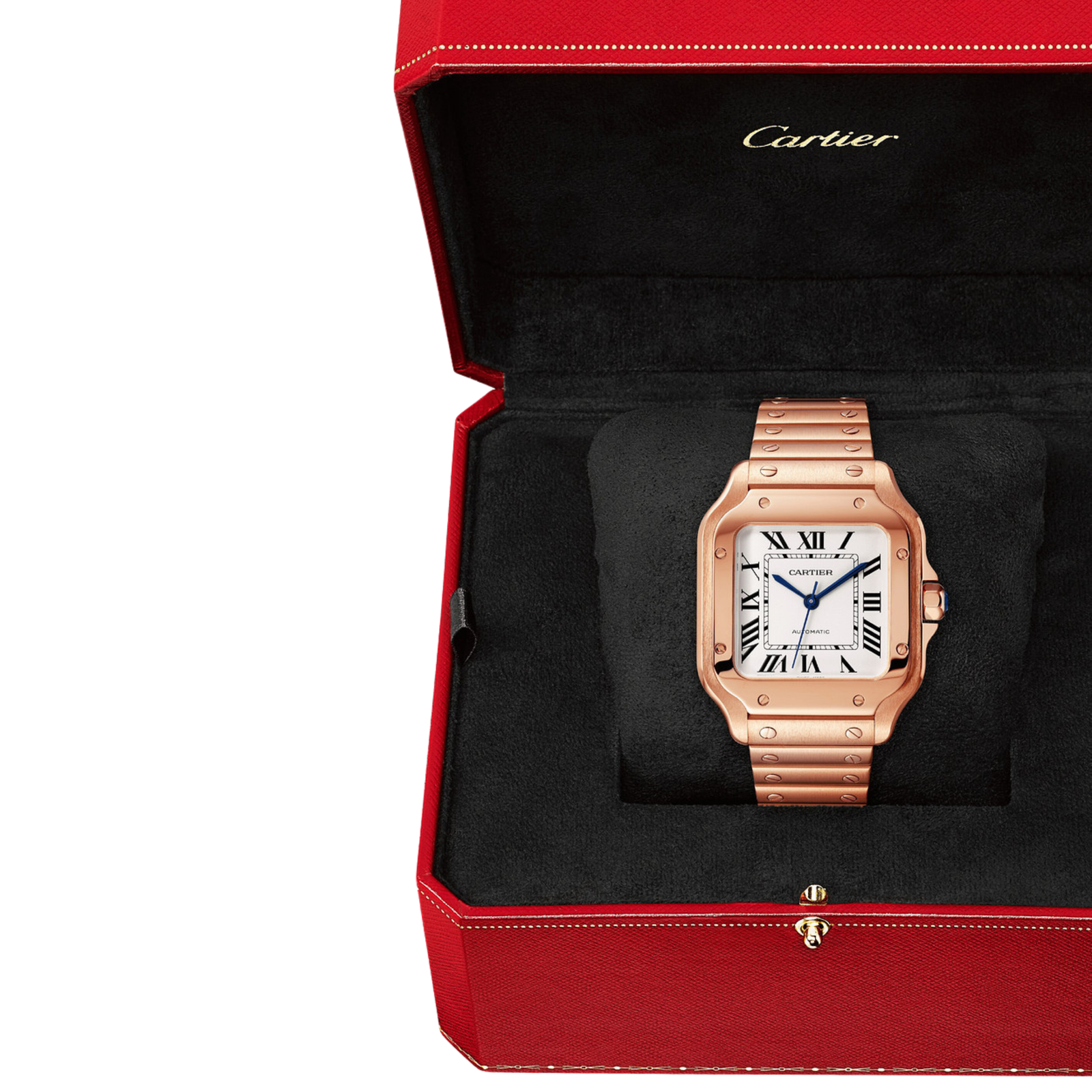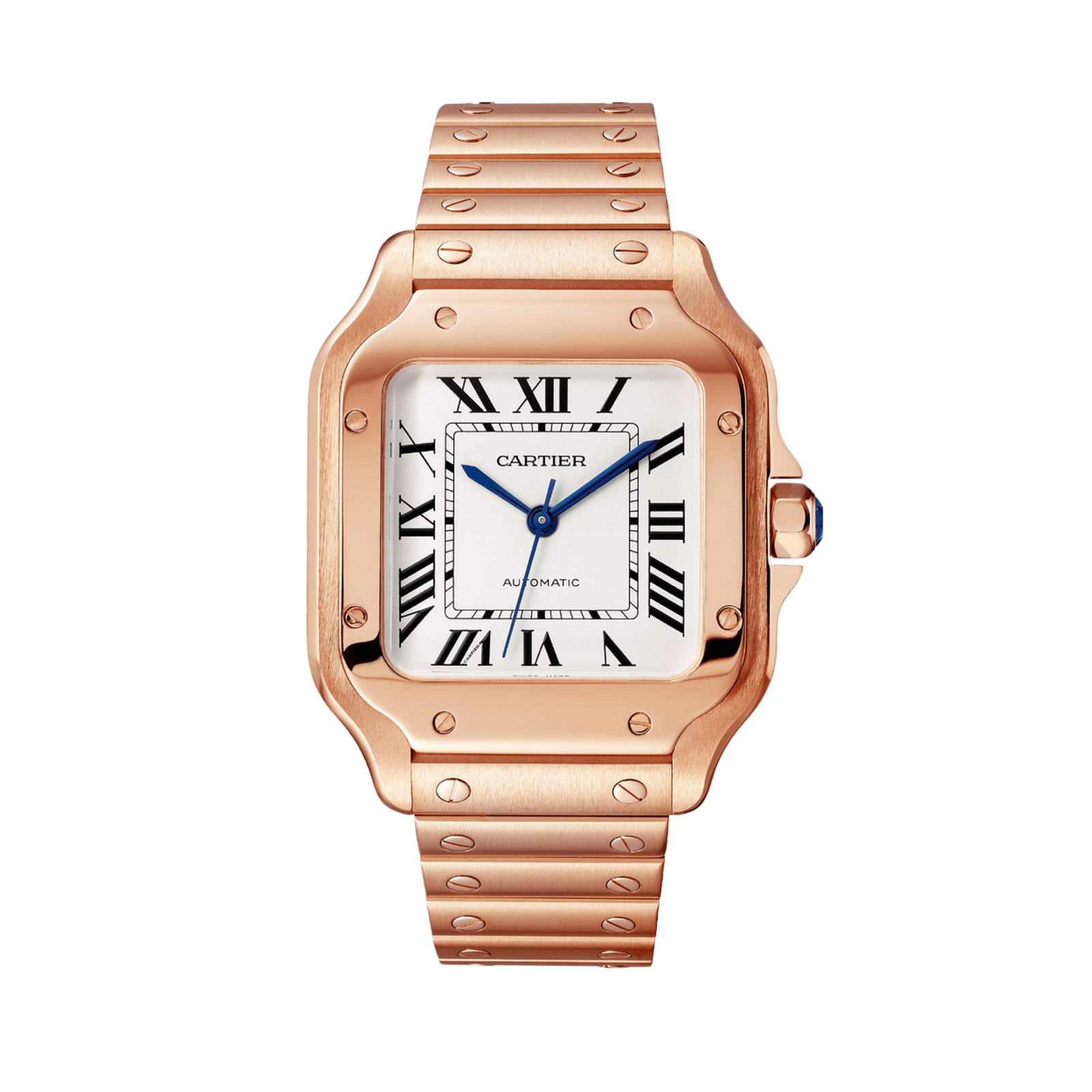 Boîtier carré de 36 mm en acier inoxydable finition or rose : un design puissant et raffiné, symbole d’élégance intemporelle.