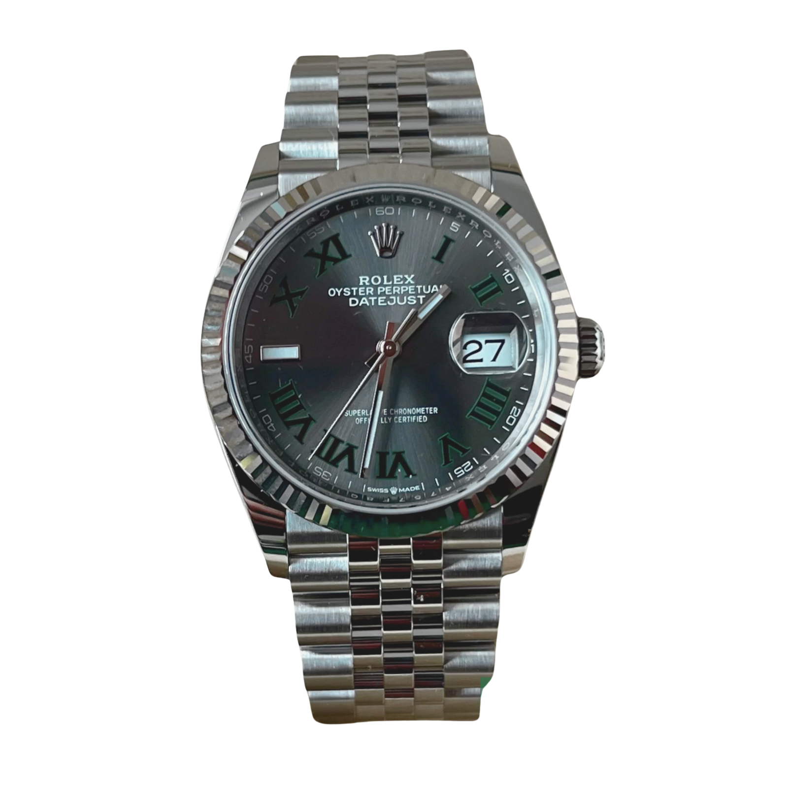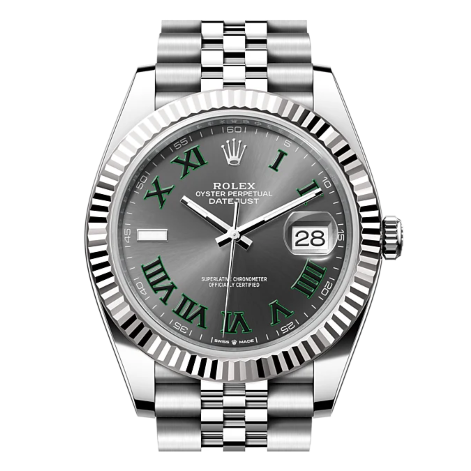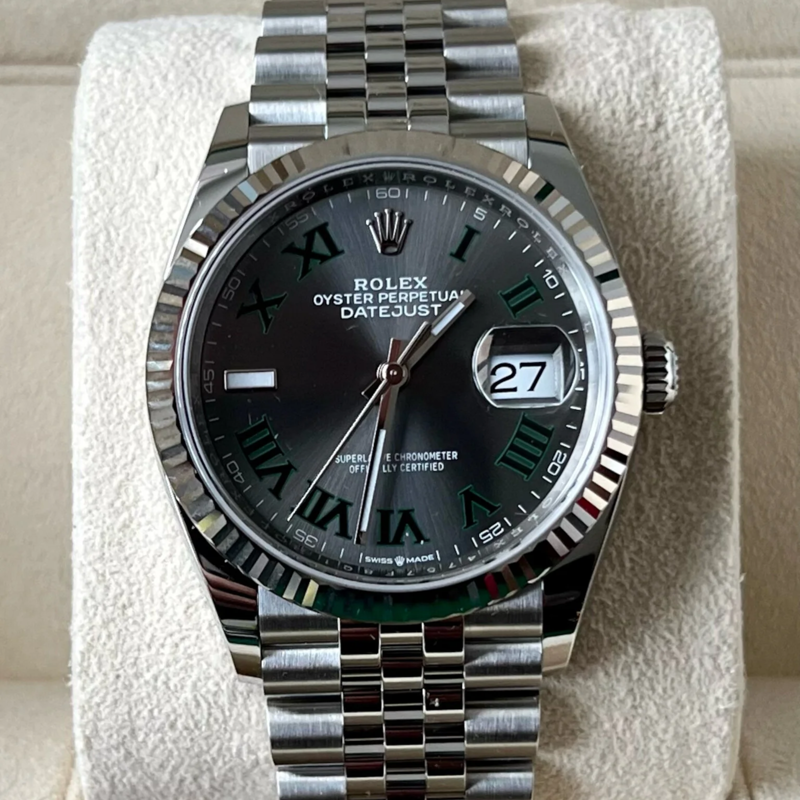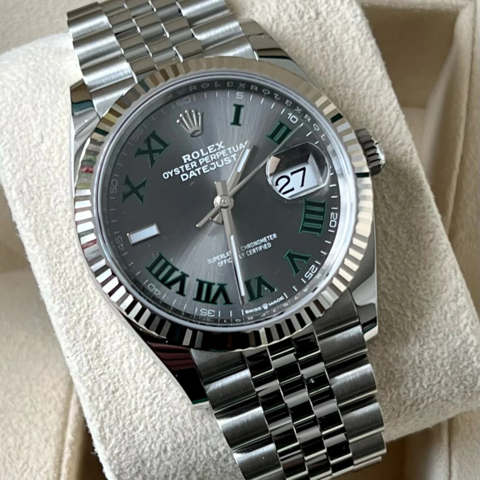 Cadran Wimbledon gris anthracite avec chiffres romains verts, finition texturée.