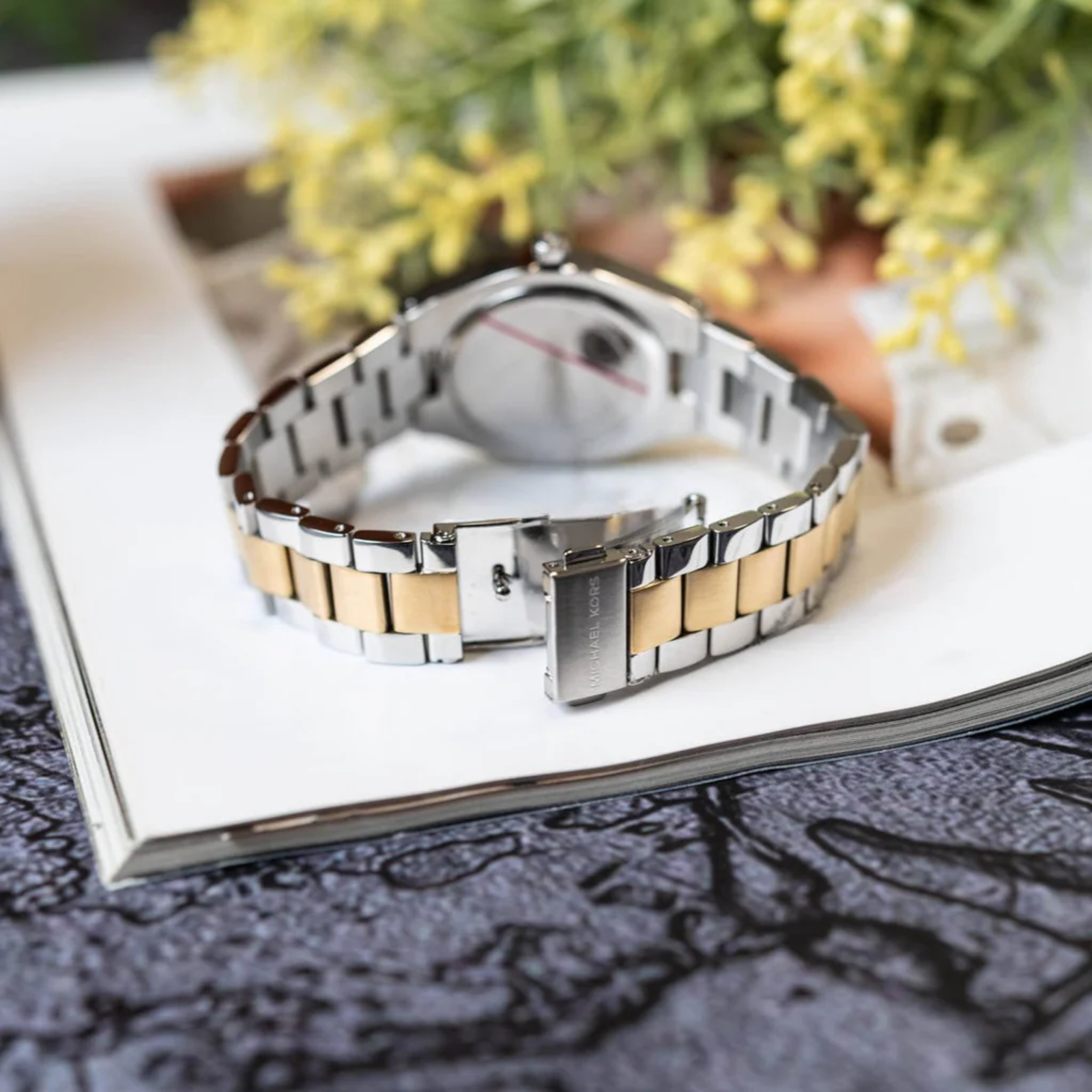Bracelet bicolore (argent & or) en acier inoxydable, largeur 20 mm – élégance et robustesse.