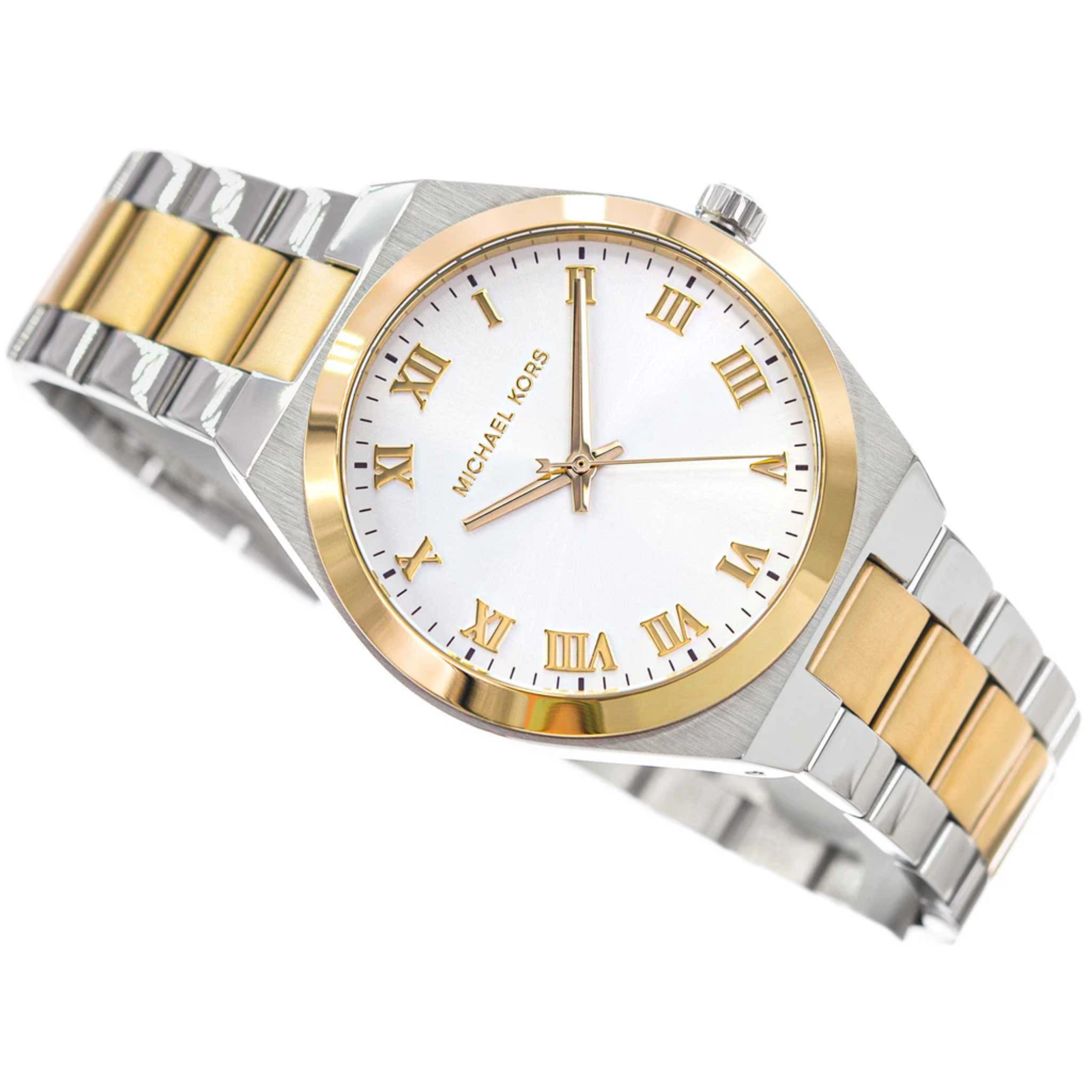 Cadran argenté à effet soleillé avec index romains dorés : une touche classique au rendu lumineux.