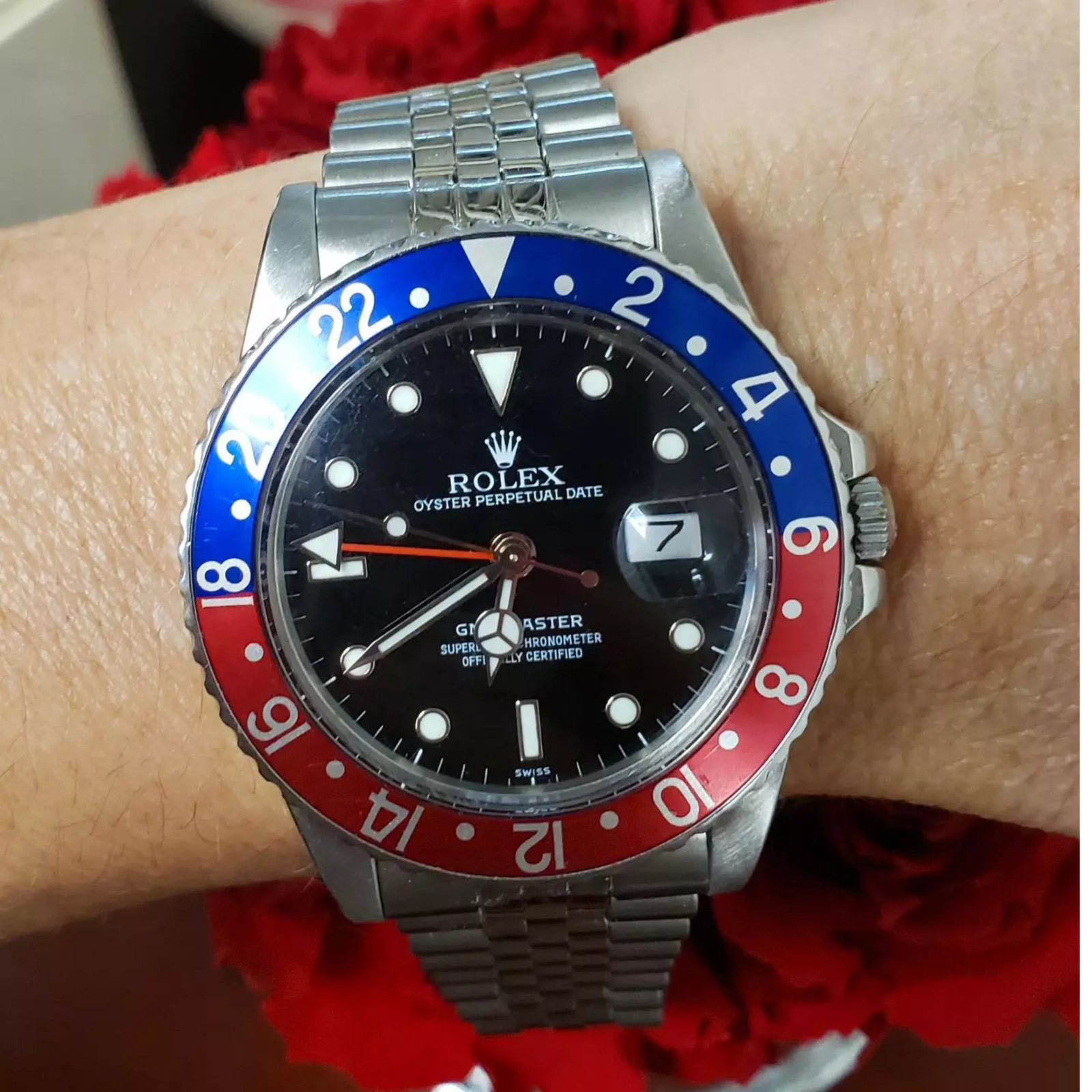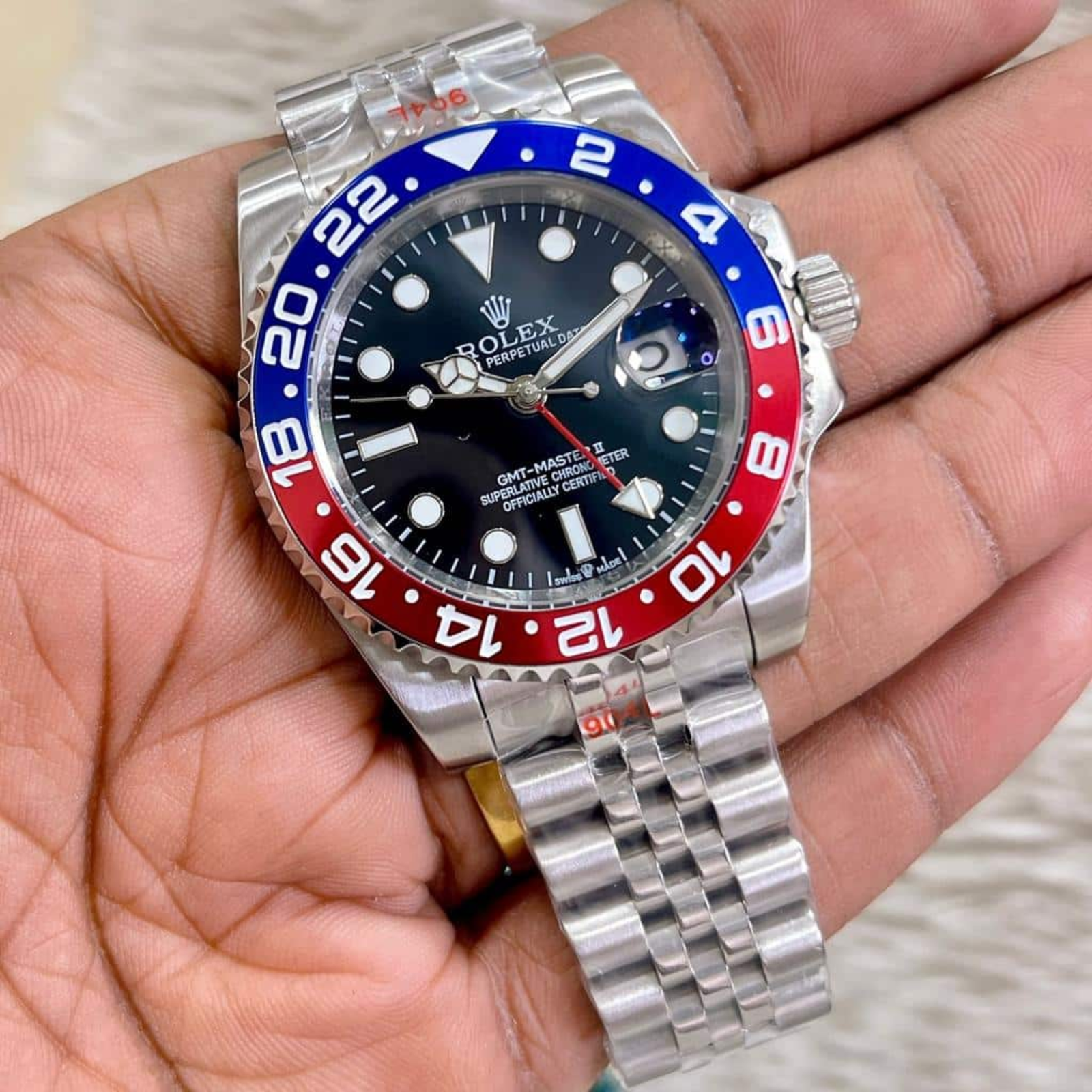Lunette tournante rouge et bleue, double fuseau horaire pratique pour les voyageurs.