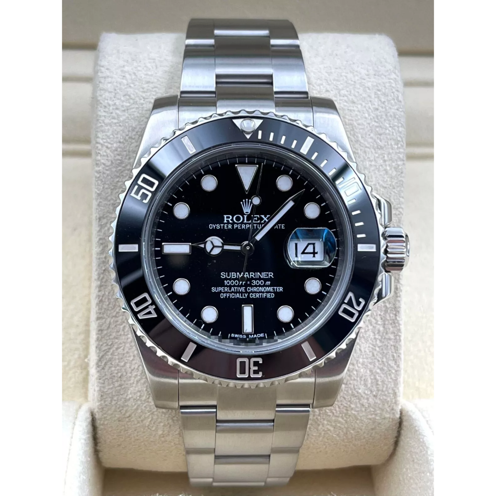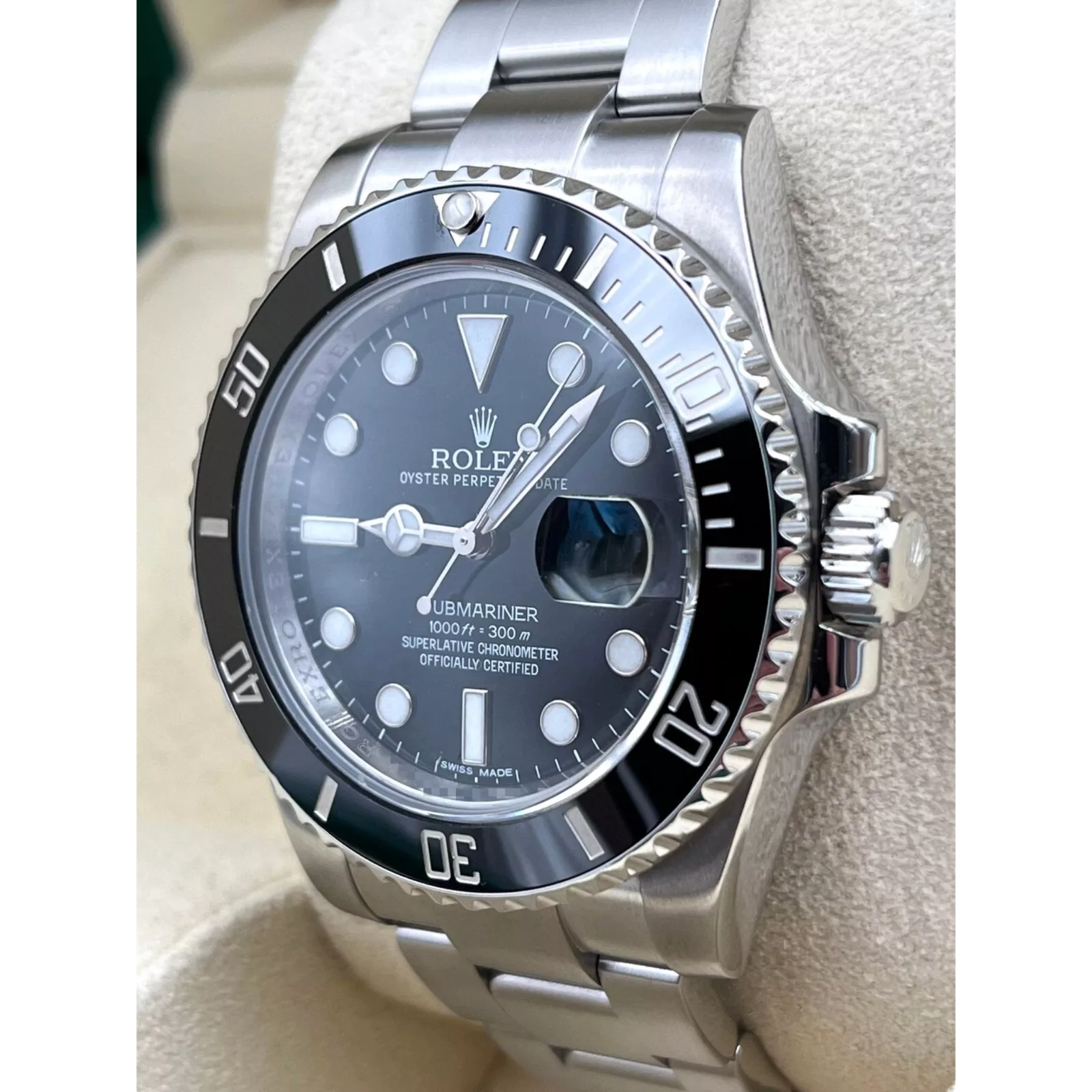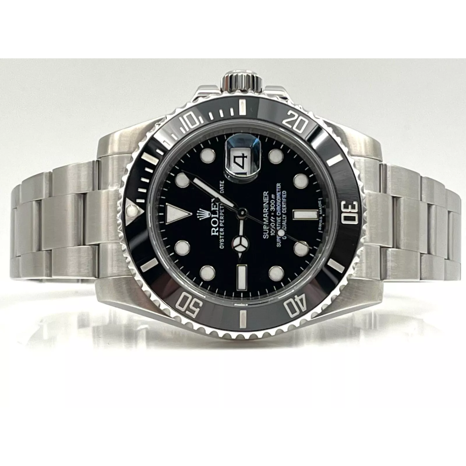 Cadran noir intense : index ronds lumineux et affichage de la date avec loupe.