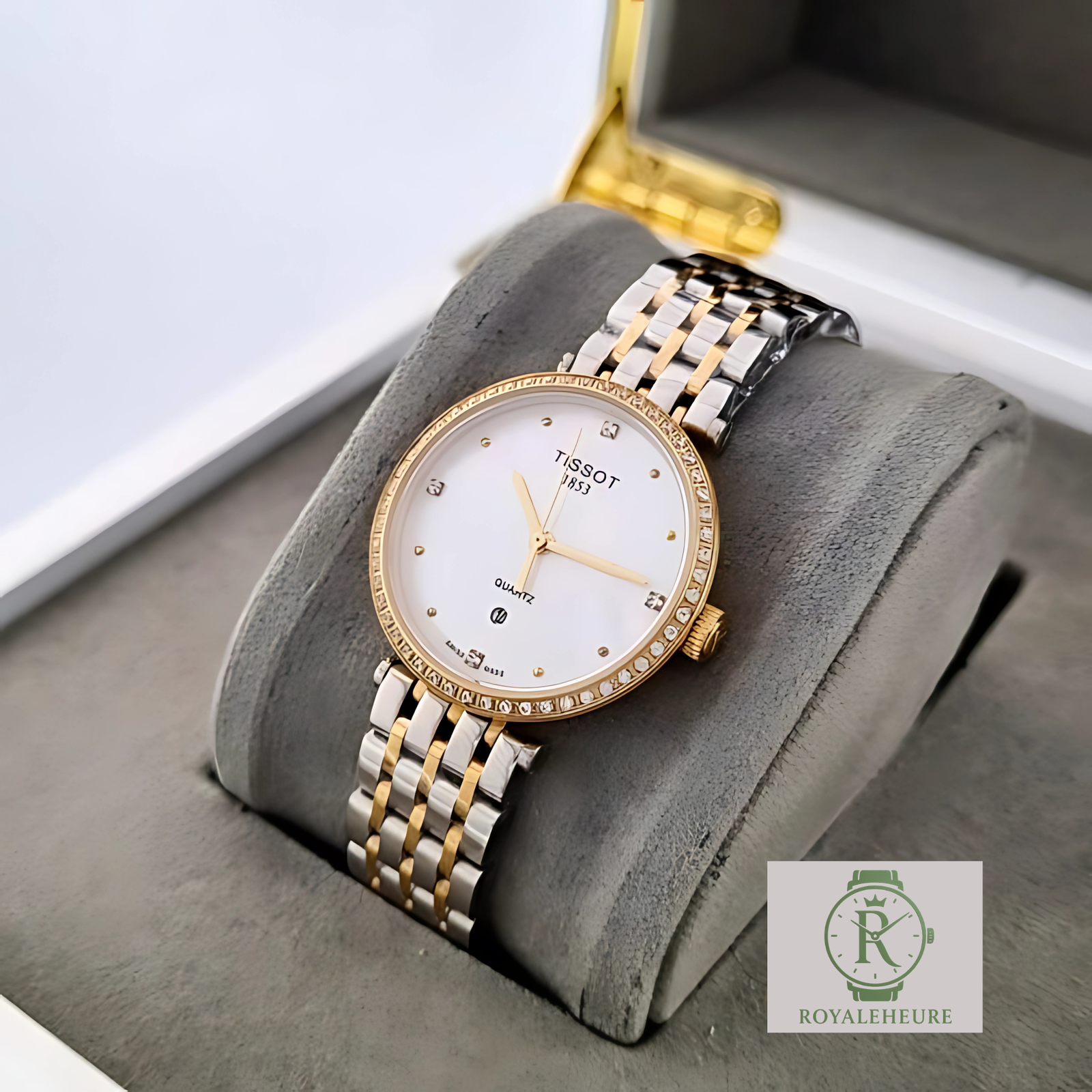 Cadran nacré clair aux reflets délicats, avec index fins et marqueurs brillants positionnés avec subtilité. Guichet date positionné à 6h.