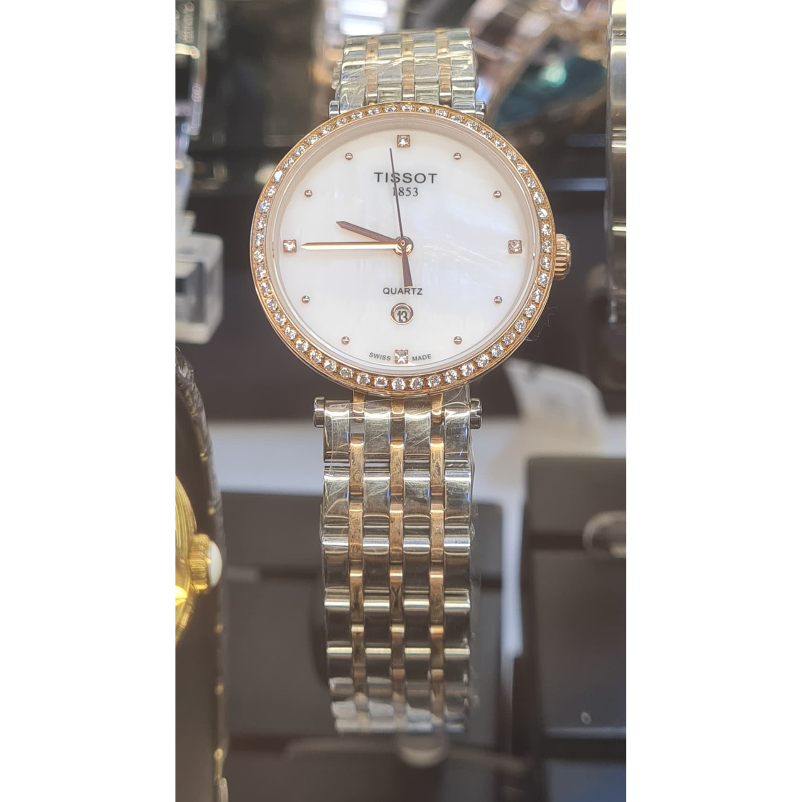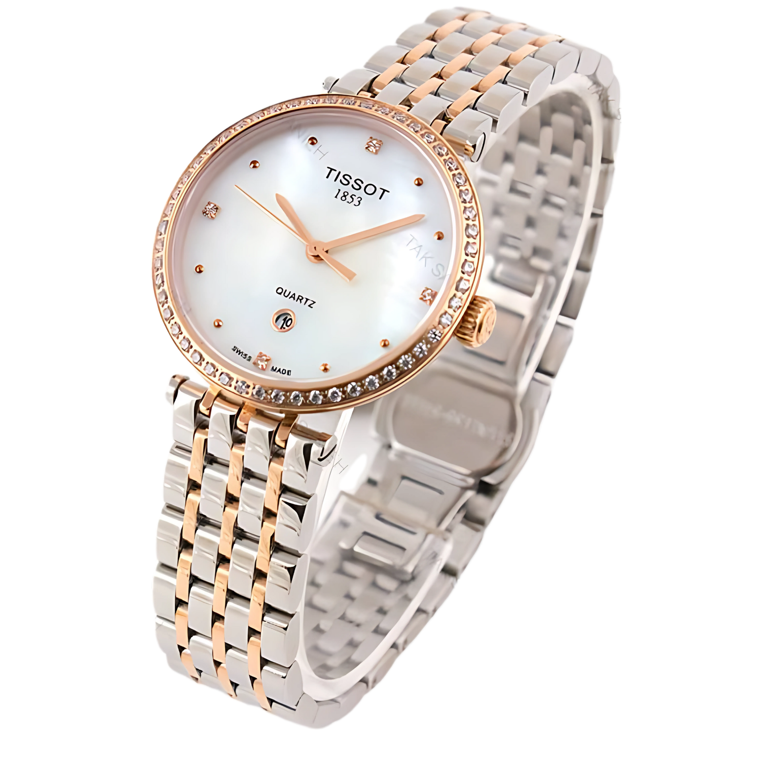 Boîtier rond de 30 mm en acier inoxydable, finition bicolore argentée et rosée avec une fine rangée de strass décoratifs sur la lunette.